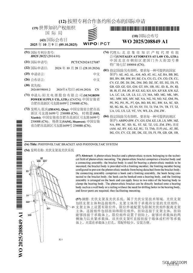 根据企查查数据显示阳光电源(300274)公布了一项国际专利申请,专利名为“光伏支架及光伏系统”,专利申请号为PCT/CN2024/127687.国际公布日为2025年10月9日。
