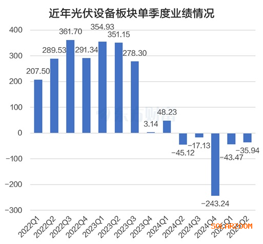 再从业绩角度来看,东方财富Choice数据显示,今年第二季度光伏设备板块实现归母净利润为-35.94亿元,较今年第一季度的-43.47亿元少亏7.53亿元。而和2024年第四季度的243.24亿元亏损相比,业绩改善更加明显。
