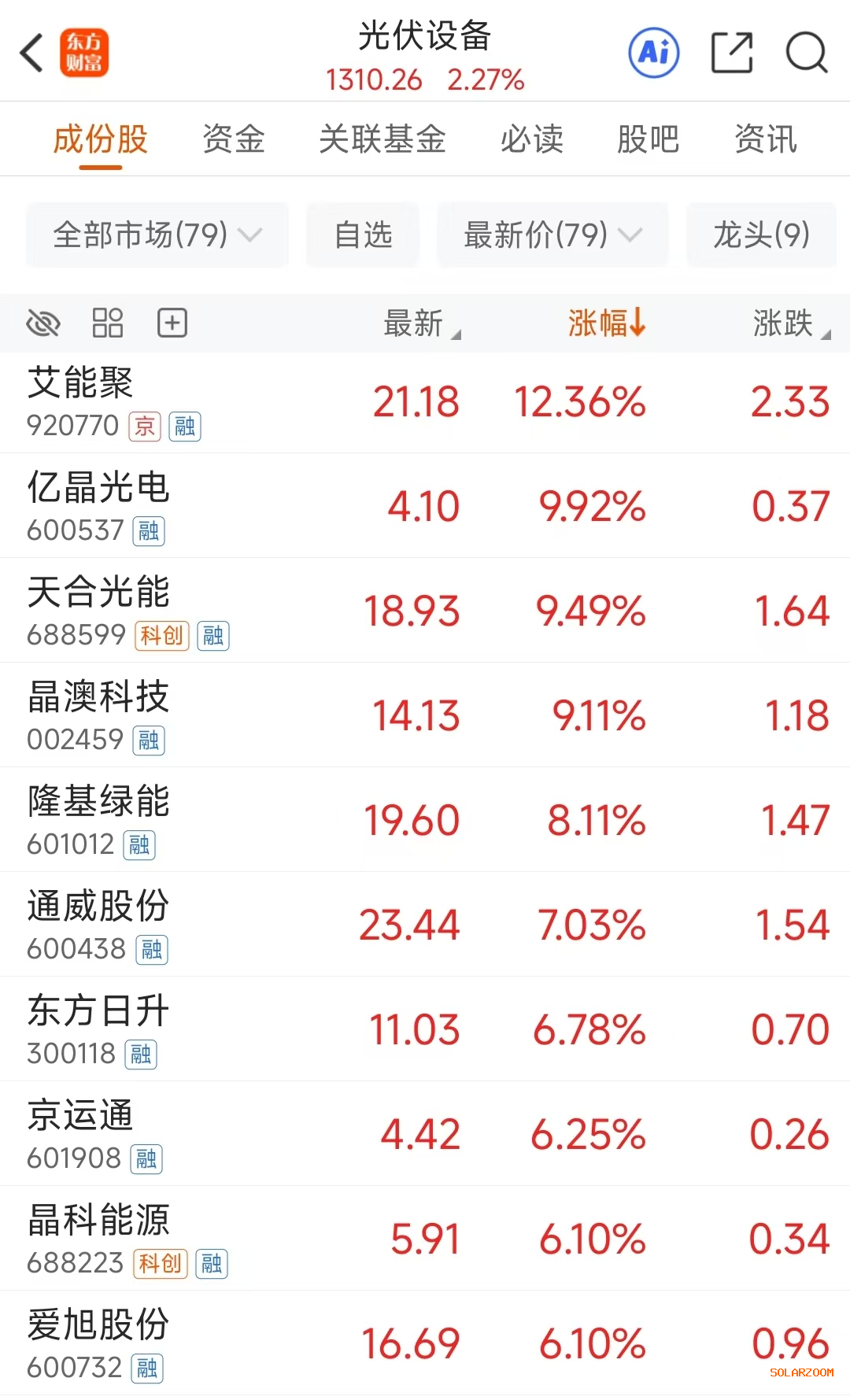 从股价表现来看,东方财富Choice数据显示,4月7日以来光伏龙头阳光电源(最新市值2978亿元)股价翻倍,累计上涨113.71%。聚合材料紧随其后,上涨89.75%。微导纳米也累涨超过80%,为81.37%。