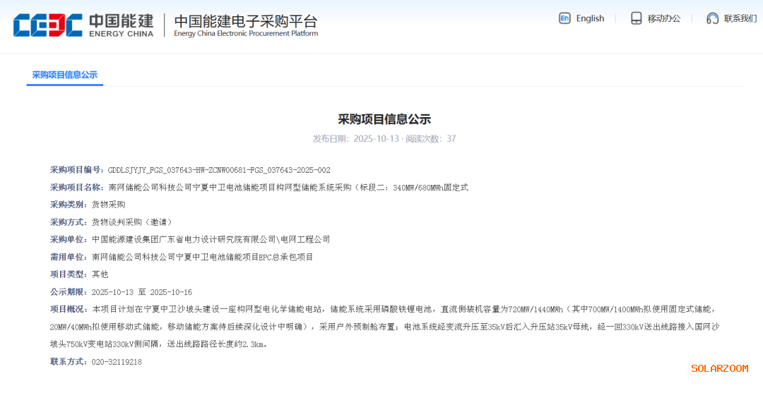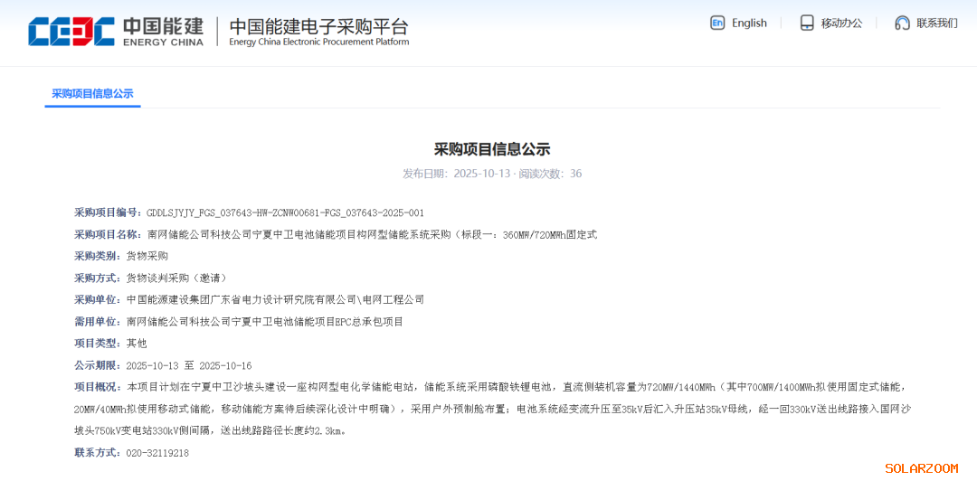 10月13日,中国能源建设集团广东省电力设计研究院有限公司\电网工程公司发布南网储能公司科技公司宁夏中卫电池储能项目构网型储能系统采购信息公示。本次采购分为两个标段,规模共计700MW/1400MWh。