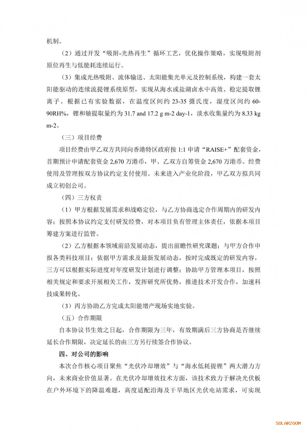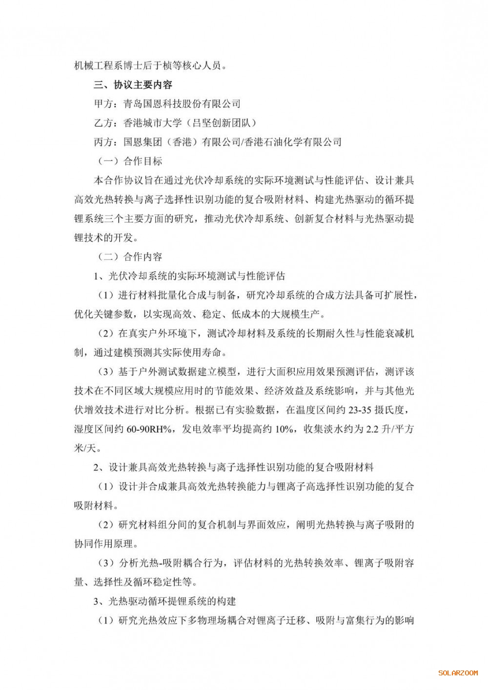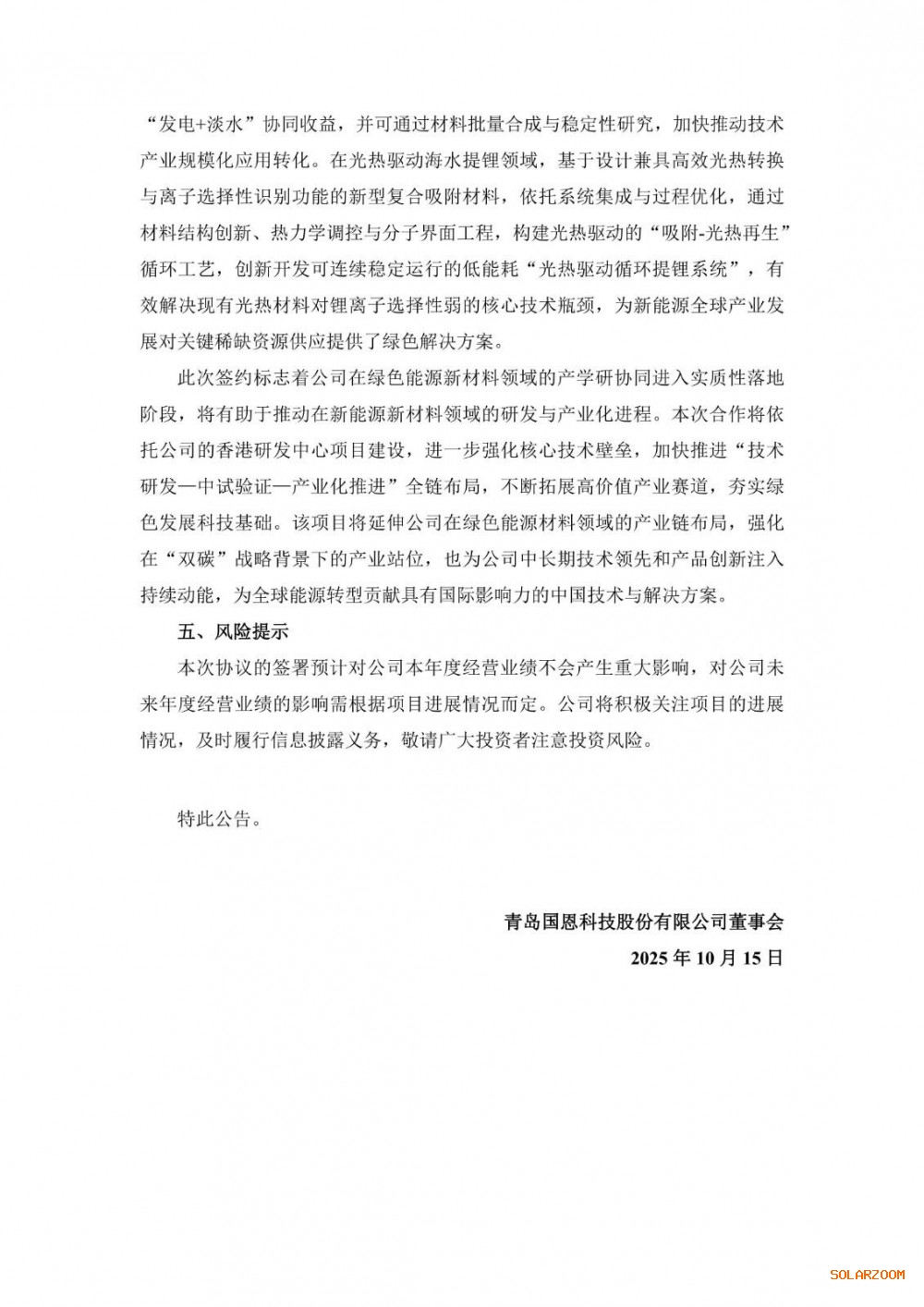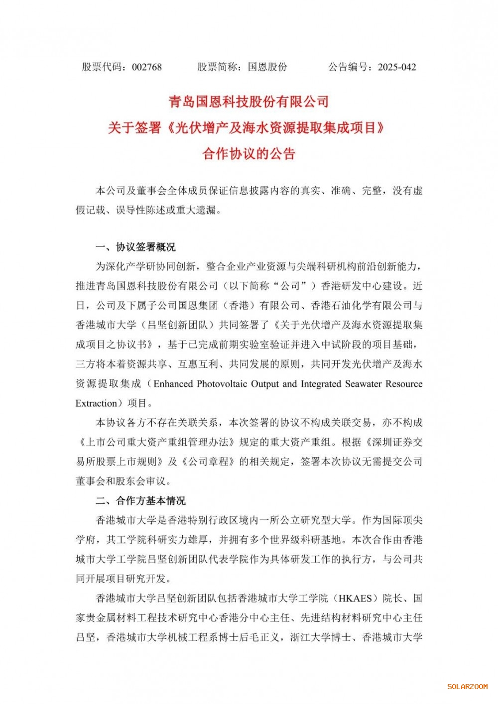 10月14日,国恩股份发布公告称,为深化产学研协同创新,整合企业产业资源与尖端科研机构前沿创新能力,推进青岛国恩科技股份有限公司(以下简称“公司”)香港研发中心建设。近日,公司及下属子公司国恩集团(香港)有限公司、香港石油化学有限公司与香港城市大学(吕坚创新团队)共同签署了《关于光伏增产及海水资源提取集成项目之协议书》,基于已完成前期实验室验证并进入中试阶段的项目基础,三方将本着资源共享、互惠互利、共同发展的原则,共同开发光伏增产及海水资源提取集成(EnhancedPhotovoltaicOutputandIntegratedSeawaterResourceExtraction)项目。