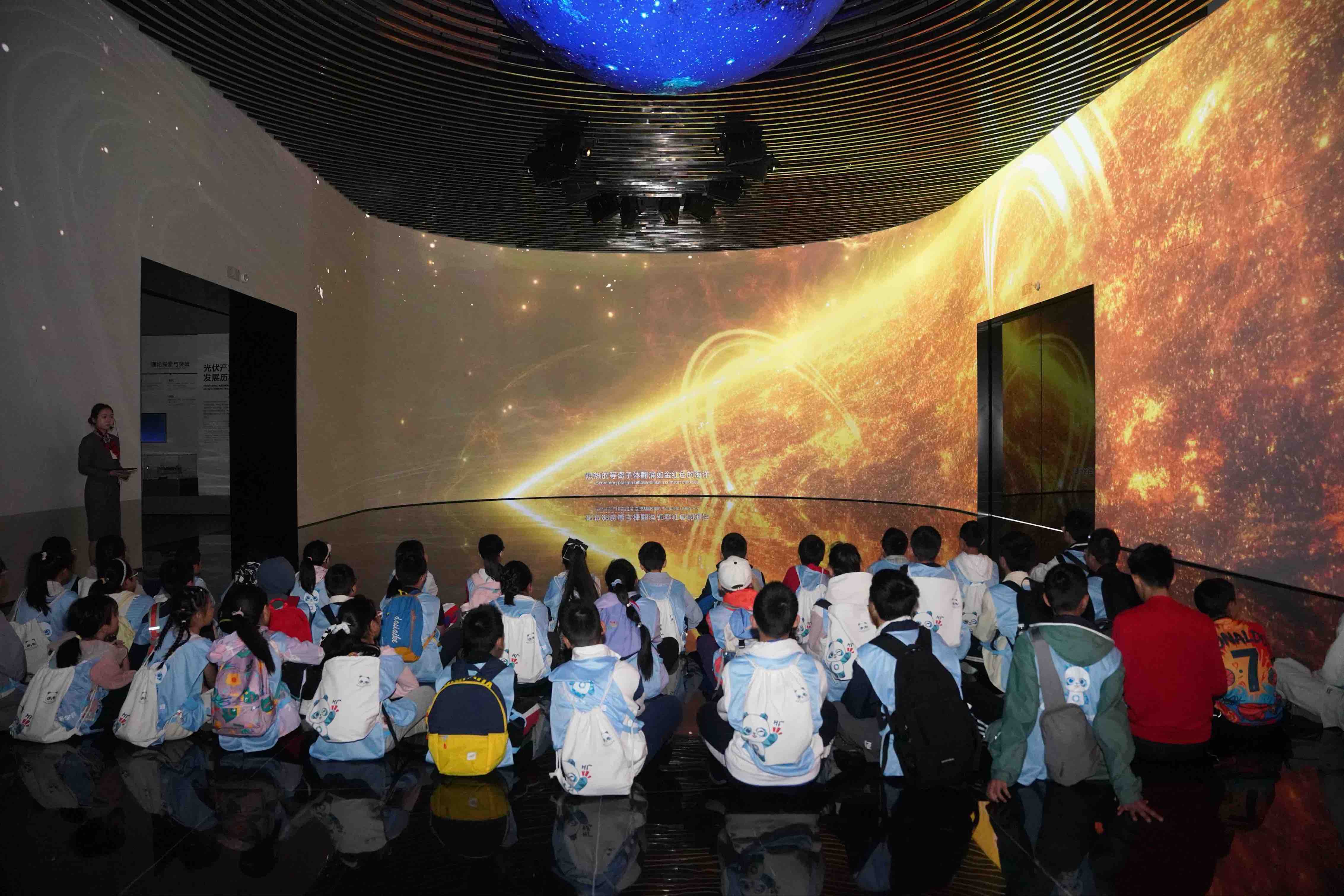 活动伊始,同学们就“掉”进了光伏的奇妙世界。在通威太阳能光伏科技馆,未来感十足的沉浸式影像和互动装置让大家瞬间入迷。阳光如何变成清洁电力?光伏技术如何点亮我们的生活?……这些课本上的知识,在这里变成了看得见、摸得着的生动体验。