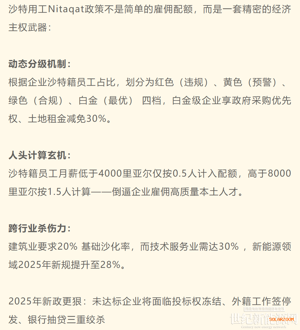 沙特政府对本地化率有明确要求,如“尼塔卡特”(Nitaqat)即沙特政府实施的劳动力本地化政策,通过配额制度要求私营部门公司雇佣一定比例的沙特国民。