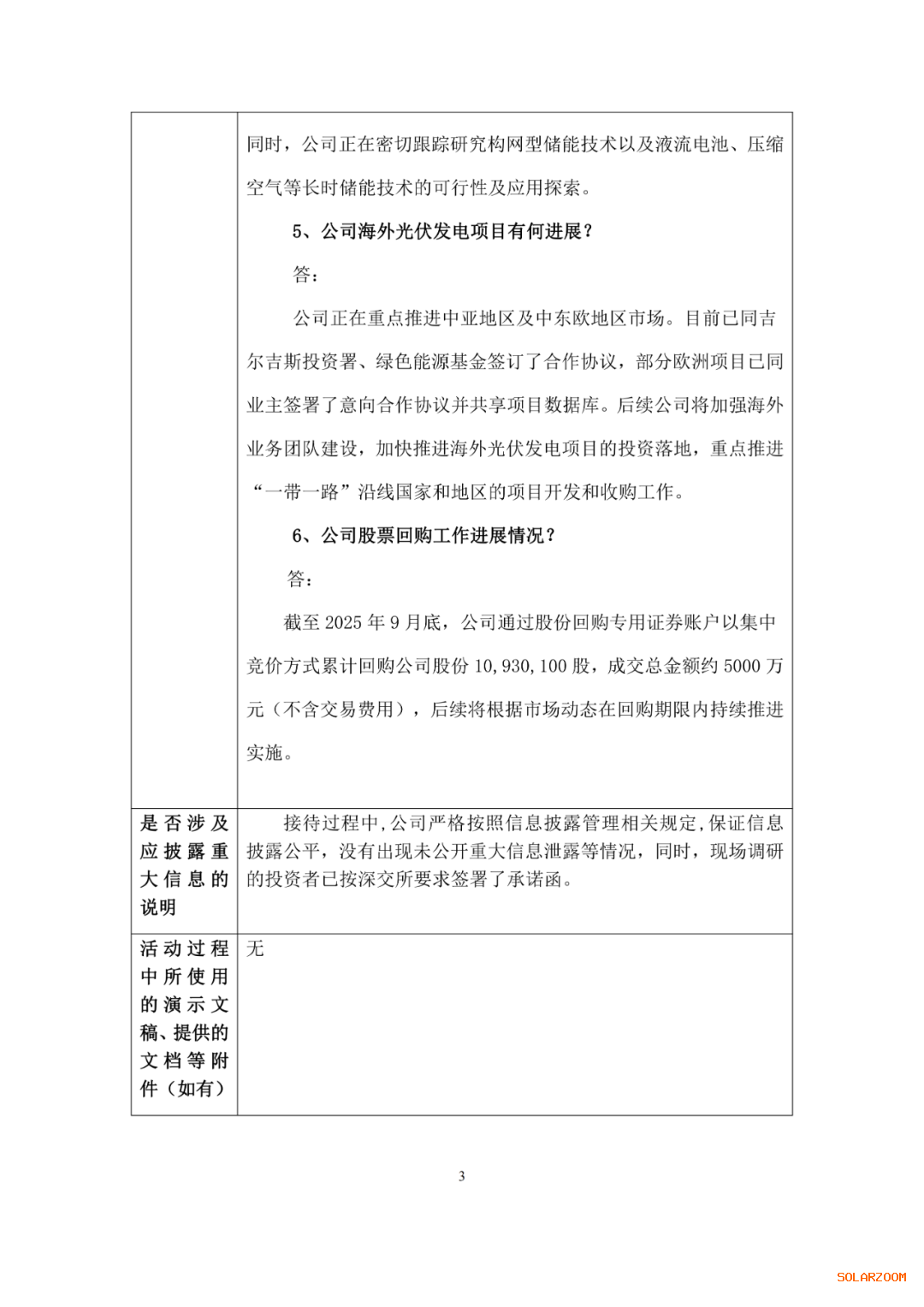 截至2025年6月底,公司运营电站约6.535GW、在建电站约2.365GW、拟建设项目电站约2.217GW、已签署预收购协议的电站规模约1.529GW,合计约12.647GW。公司作为专业的太阳能光伏发电投资运营商,将持续积极开展光伏电站建设,加速推进在建项目及收购项目的进程。