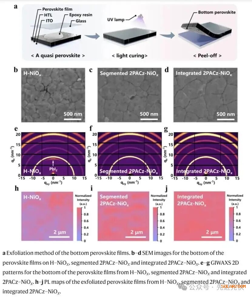 本研究通过环氧树脂辅助剥离技术揭示了钙钛矿在不同HTL基底上的结晶动力学差异。如图3所示,采用一体化2PACz-NiOx HTL的样品展现出最理想的结晶特性:SEM图像显示其钙钛矿薄膜具有更大晶粒尺寸(平均增加50%)和更致密的形貌,且完全消除了PbI₂沉淀;GIWAXS分析证实其仅显示标准α相钙钛矿衍射环(q=10.16/14.38/17.57/20.28 nm⁻¹),而传统H-NiOx样品在q=9.27 nm⁻¹处出现的PbI₂衍射环完全消失。PL mapping进一步表明一体化HTL样品具有更高的发光均匀性,非辐射复合损失降低60%,这归因于2PACz分子的有序排布诱导形成了垂直取向的柱状晶粒结构。这些发现为理解界面结晶机制提供了重要依据,证明一体化HTL能有效调控钙钛矿的成核与生长过程。