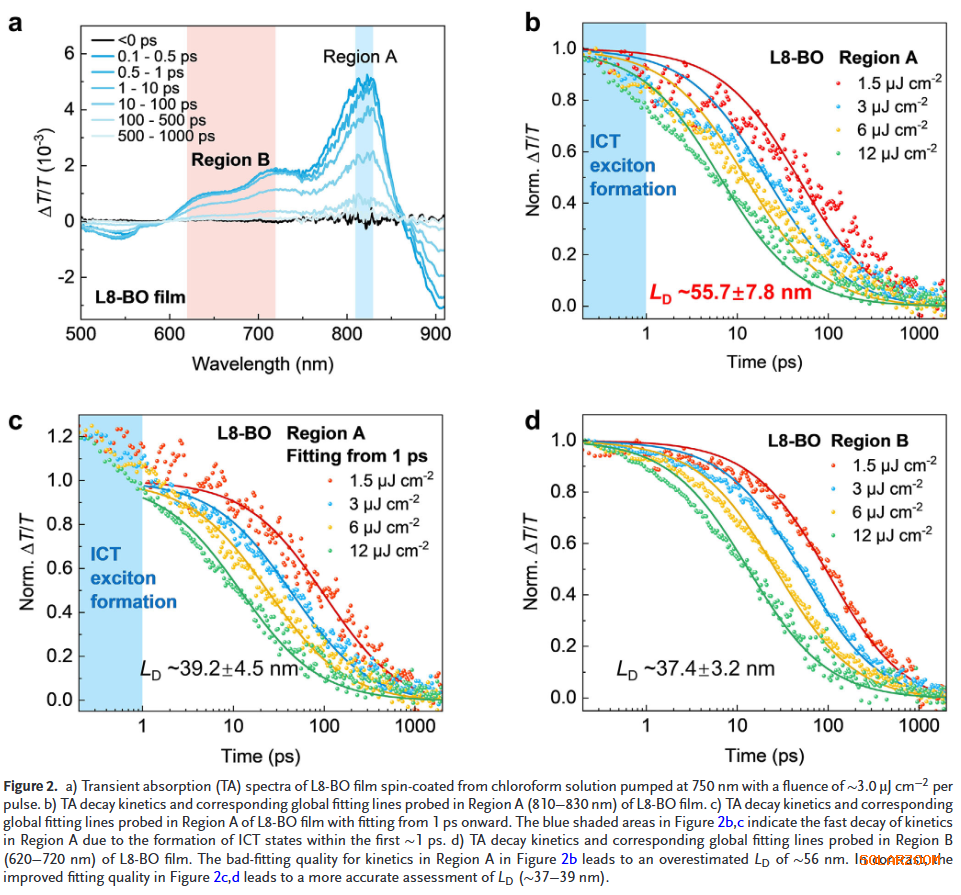 本文香港大学Philip C. Y. Chow等人指出,由于皮秒时间尺度上ICT激子形成导致光学带隙附近光谱演化,忽略此现象可能导致瞬态吸收数据分析中显著高估Y型NFA薄膜的LD。此外,在使用激子-激子湮灭模型进行数值拟合时,采用ICT激子的本征弛豫寿命对于可靠提取扩散系数和LD至关重要。