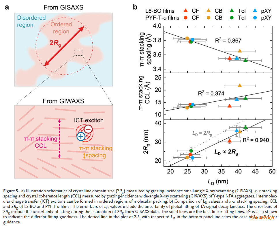 首次建立LD与晶域尺寸的直接关联通过GIWAXS/GISAXS分析,发现LD与π-π堆叠间距负相关,且与晶域尺寸(2Rg)高度匹配,表明晶域尺寸是限制激子扩散的关键因素,为通过调控晶域尺寸进一步提升LD指明方向。