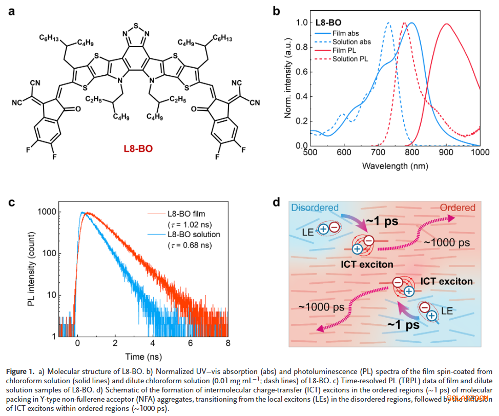 激子扩散长度(LD)是有机太阳能电池(OSCs)的关键参数。目前性能最优异的OSCs基于Y型非富勒烯受体材料(包括Y6及其衍生物)。近期研究表明,Y型NFA中会产生分子间电荷转移激子,但ICT激子形成对LD的影响尚未明确讨论。