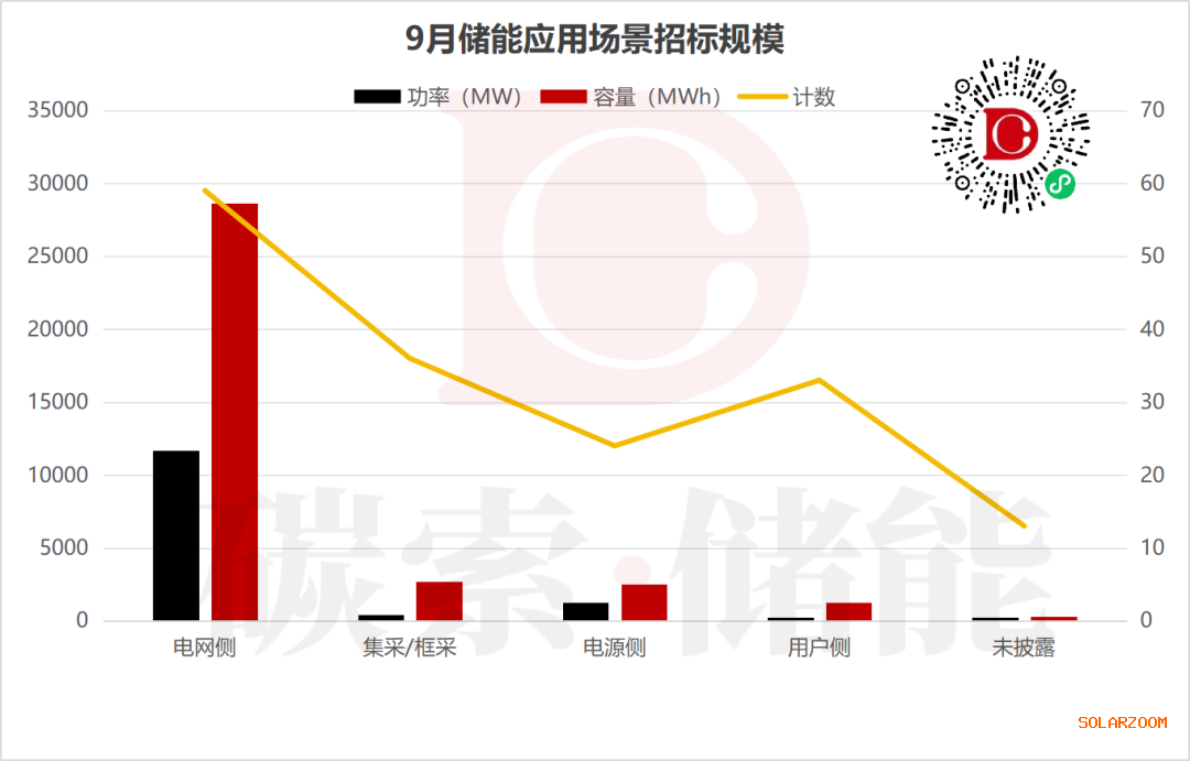 9月储能应用场景中,电网侧以绝对优势领跑,功率超10GW,容量近30GWh,且项目数量也最多。电网侧储能在保障电网稳定、调峰调频等方面发挥着关键作用,随着电网对新能源消纳和电力平衡要求的提高,其需求持续攀升。