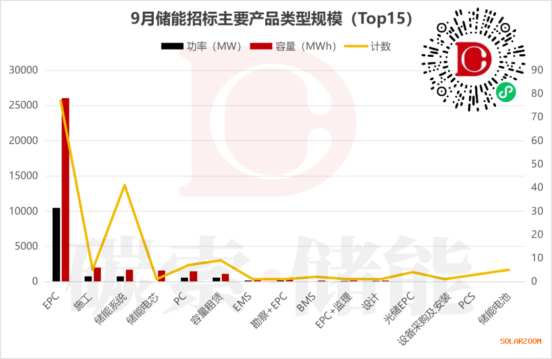 在9月储能招标主要产品类型中,EPC(工程总承包)的功率和容量遥遥领先,77个项目对应规模10.47GW/26.04GWh,占据绝对主导地位。储能项目建设中,效率至上,整合设计、采购、施工等各环节资源,提高项目推进效率。