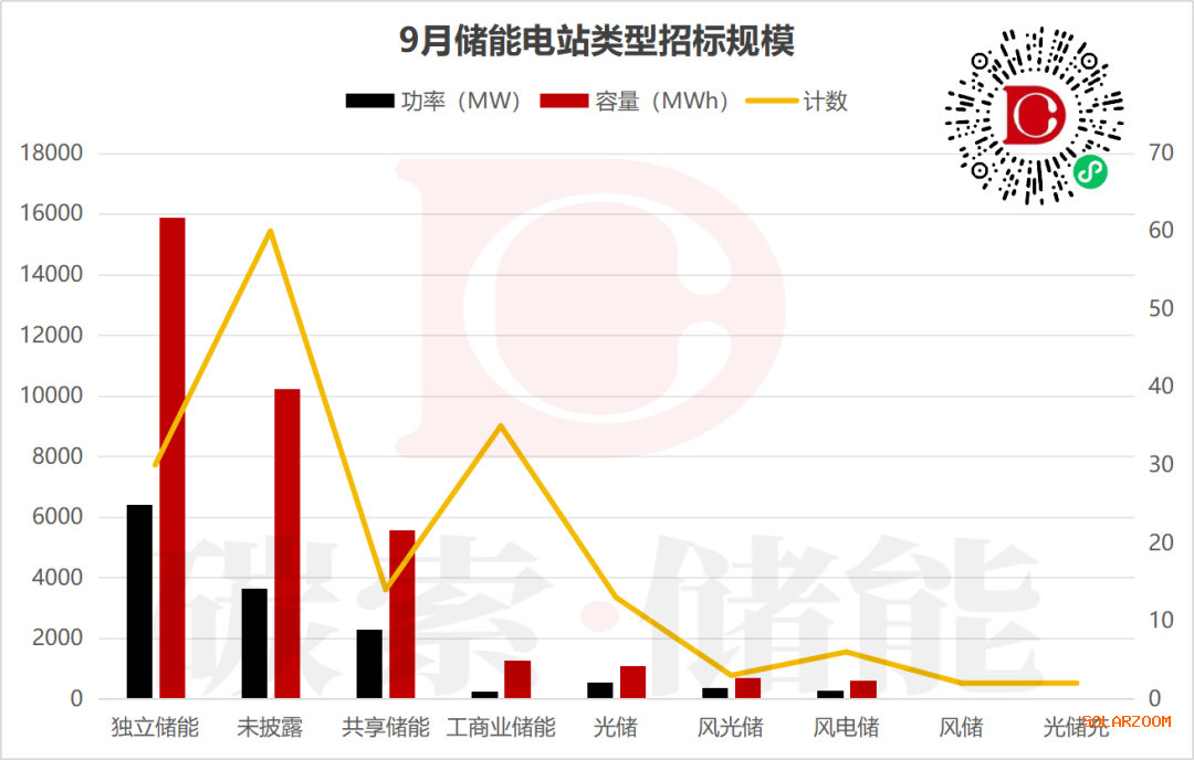 9月储能电站类型招标规模里,独立储能的功率和容量均位居首位,对应规模6.43GW/15.89GWh。