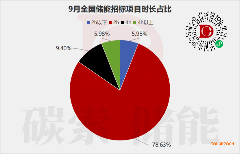 9月全国储能招标项目时长占比中,2小时时长的项目占比高达78.63%,占据绝对主导地位。此类项目在平衡电力负荷、保障短时电力供应等方面能较好地满足市场需求。