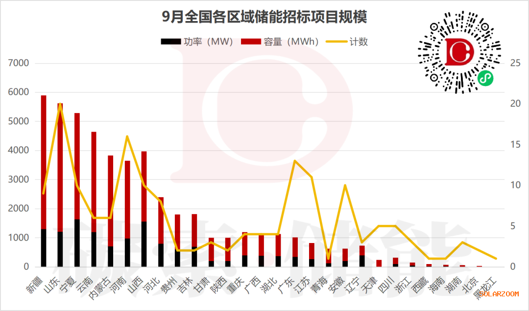 9月全国各区域储能招标项目规模呈现出明显的地域差异。新疆、山东、宁夏等地区表现抢眼,招标的功率和容量均处于全国前列。规模分别为1.30GW/4.60GWh、1.21GW/4.42GWh、1.63GW/3.66GWh。这些地区或是拥有丰富的风光资源,对储能配套需求大,以实现新能源电力的稳定输出与消纳;或是储能产业布局较为完善,上下游产业链协同发展,推动了本地及周边储能项目的招标采购。