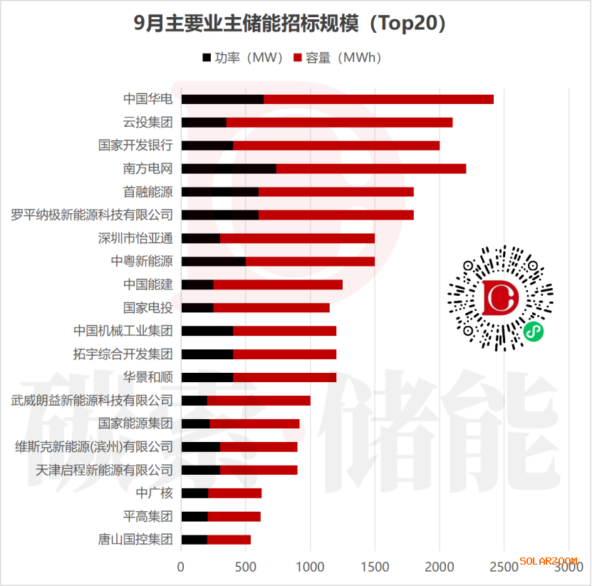 从9月主要业主储能招标规模(Top20)来看,中国华电、云投集团、国家开发银行、南方电网等大型企业和机构占据前列。