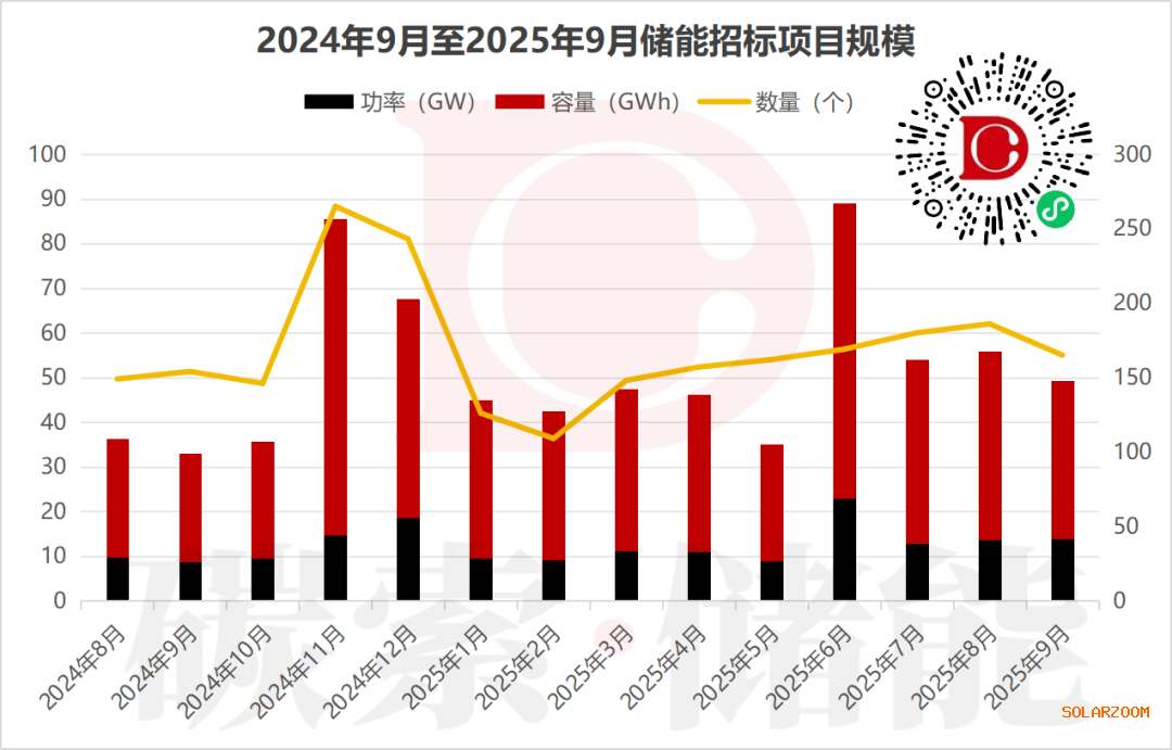 从最近一年储能招标项目规模变化来看,9月功率、容量虽较前几月峰值有所回落,但仍处于较高水平,项目数量也维持在150个左右。表明储能市场依旧保持着旺盛的态势,行业发展的基本面稳固,为产业链各环节企业提供了持续的市场机会。