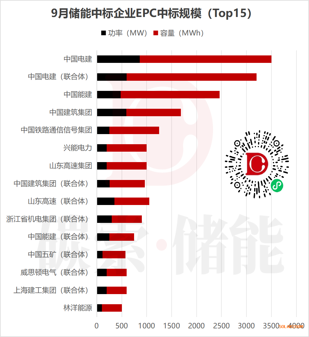 EPC领域:中国电建在9月储能中标企业EPC中标规模(Top15)中位居前列,不仅自身,其联合体形式也斩获大量项目,功率和容量均处于第一梯队;中国能建、中国建筑集团等企业表现不俗,分列2、3名。