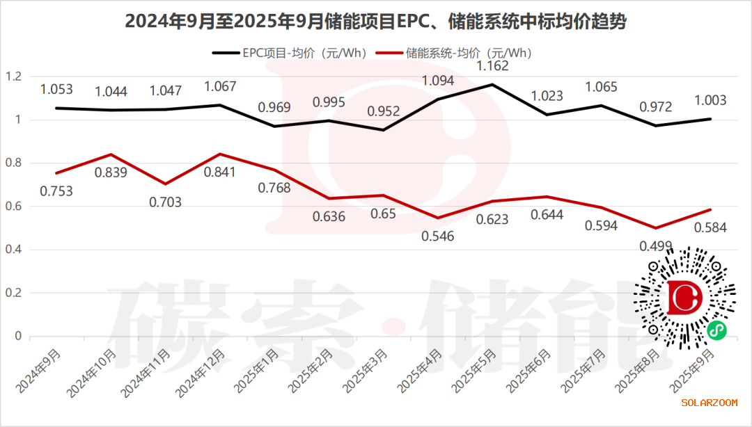 观察2024年9月至2025年9月储能项目EPC、储能系统中标均价趋势,EPC项目均价整体在1元/Wh左右波动,2025年5月达到1.162元/Wh的阶段性高点后有所回落,9月为1.003元/Wh。