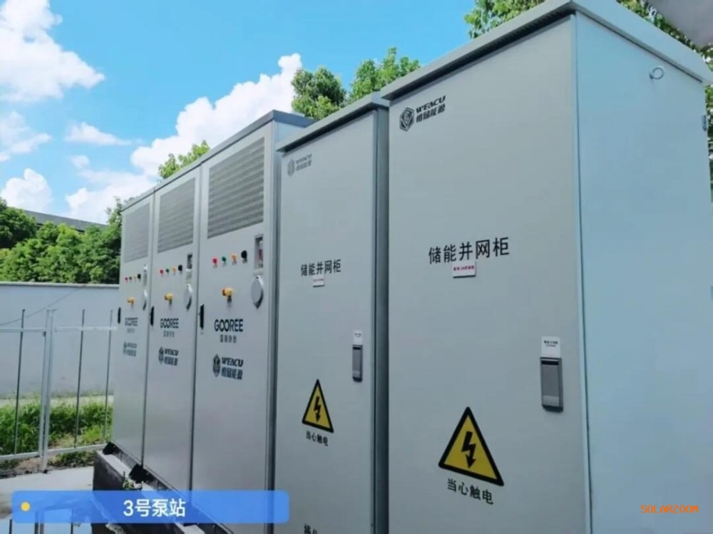 此储能项目的总装机容量为2.25MW/4.338MWh,在各泵站内分布式部署18台125KW/241KWh储能设备,实现就近供电、灵活调度。