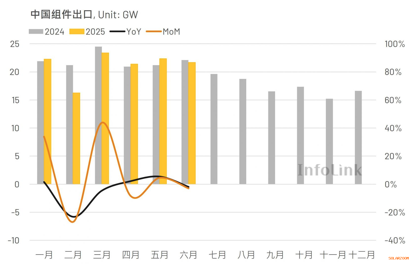 而美国2025年Q2新增了4.3GW光伏产能,总产能来到55.4GW,光伏组件本土化持续推进。2025年1-7月美国组件+电池合计进口35.2GW,同比下降20%。