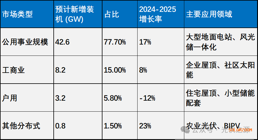 美国能源信息署(EIA)预测数据显示,2025年美国新增光伏装机将达到54.8GW,其中电力部门运营的公用事业规模光伏占 42.6GW,工商业及户用光伏分别占 0.8GW 和 8.2GW。