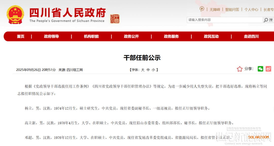 此前9月26日,四川省人民政府发布干部任前公示。公示表明,邓超,男,汉族,1976年12月生,大学、在职硕士,中共党员,现任省发展改革委党组成员、省能源局局长,拟任省管企业正职。