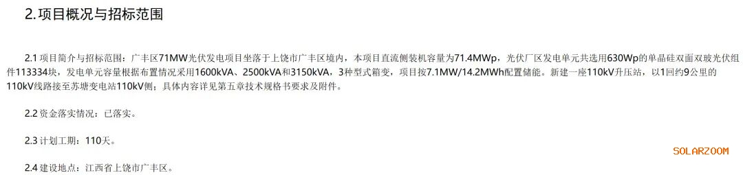 8月8日广丰区71MW光伏发电项目EPC总承包首次发布招标公告。公告显示,项目位于江西上饶市广丰区境内。本项目直流侧装机容量为71.4MWp,并按7.1MW/14.2MWh配置储能等。项目计划工期110天。