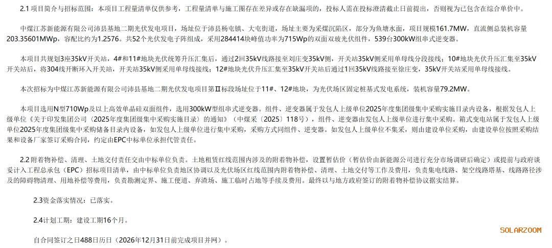 据悉,中煤江苏新能源有限公司沛县基地二期光伏发电项目第1标段、第2标段两大项目均于9月29日发布EPC总承包招标公告,项目位于江苏省徐州市沛县杨屯镇、大屯街道,装机规模161.7MW(其中,标段1装机容量82.5MW、标段2装机容量79.2MW),直流侧总装机容量203.35601MWp,容配比约为1.2576.