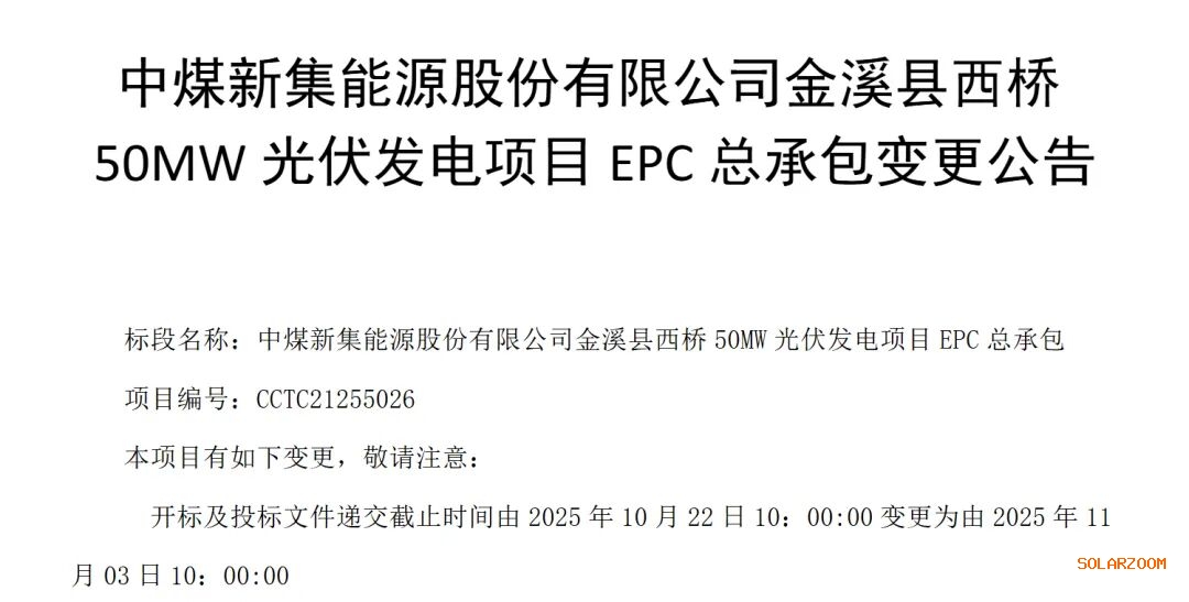 中煤新集能源股份有限公司金溪县西桥50MW光伏发电项目EPC总承包【重新招标】变更公告,投标文件递交及开标截止时间由 2025年10月 22日 10:00:00 变更为 2025 年 11月 03 日 10:00:00.
