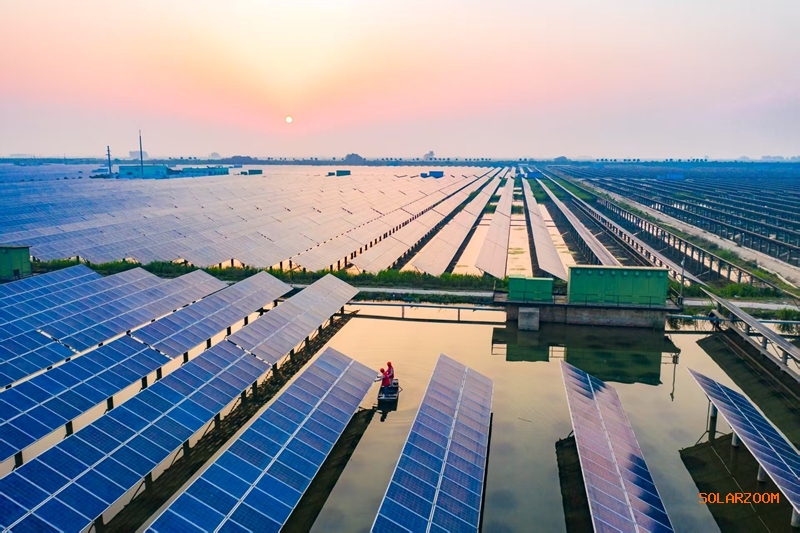 阳光穿过湛蓝的光伏矩阵,养殖户黄志亮撑着一叶小舟,穿行在光伏廊道间,手起铲落,饲料均匀地洒向水中鱼虾。