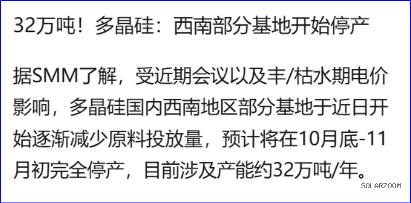 供需失衡的光伏产业,正在价格触底与政策驱动的双重作用下,艰难探寻新的平衡点。据SMM消息,受近期政策会议及丰枯水期电价调整影响,中国西南地区部分多晶硅生产基地已逐步降低原料投放量,预计在10月底至11月初实现全面停产,涉及年产能约32万吨。