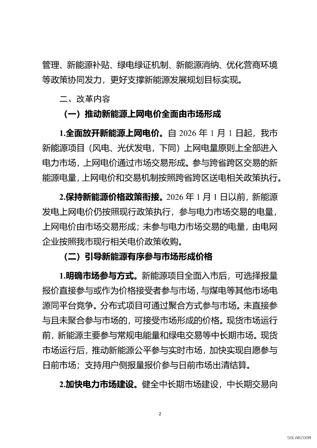 结合我市现行电力市场建设进展,自2026年1月1日起,我市新能源项目上网电量原则上全部进入电力市场,上网电价通过市场交易形成。为做好政策衔接,2026年1月1日以前,新能源发电上网电价仍按照现行政策执行。参与电力市场交易的电量,上网电价由市场交易形成;未参与电力市场交易的电量,由电网企业按照我市现行相关电价政策收购。