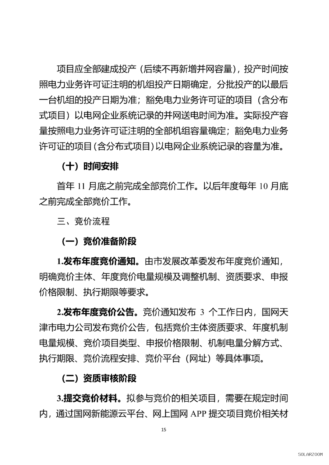 我委每年将发布竞价通知,明确竞价主体、年度竞价电量规模及调整机制、申报价格限制、执行期限等事项,并在我委政务网站公布。国网天津市电力公司按照竞价通知要求,尽快发布竞价公告,明确竞价工作流程、时间安排、竞价平台(网址)等具体事项以及项目审查要点、各类主体操作手册、发电企业授权委托书等附件内容。拟参与竞价的增量新能源项目,在规定时间内通过国网新能源云平台(集中式新能源项目)、网上国网APP(分布式新能源项目)提交竞价材料,市发展改革委、市工业和信息化局及国网天津市电力公司组成的竞价工作小组将对提交材料的完整性、合规性进行审核并公示。通过资质审核的新能源项目可进行报量报价,竞价信息申报提交后将自动封存,不允许更改,确保竞价工作的公平公正。