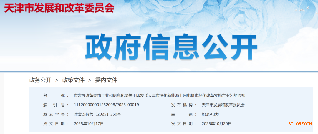 10月20日,天津市发展改革委、市工业和信息化局发布《天津市深化新能源上网电价市场化改革实施方案》、《天津市增量新能源项目机制电量竞价工作实施细则》,以及官方文件解读(政策原文见附件)。根据文件,