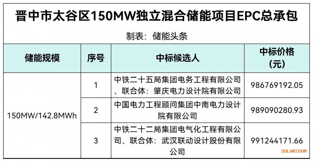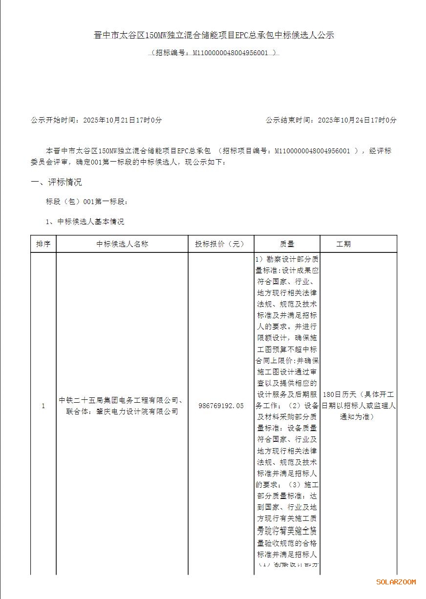 10月21日,晋中市太谷区150MW独立混合储能项目EPC总承包中标候选人公示。