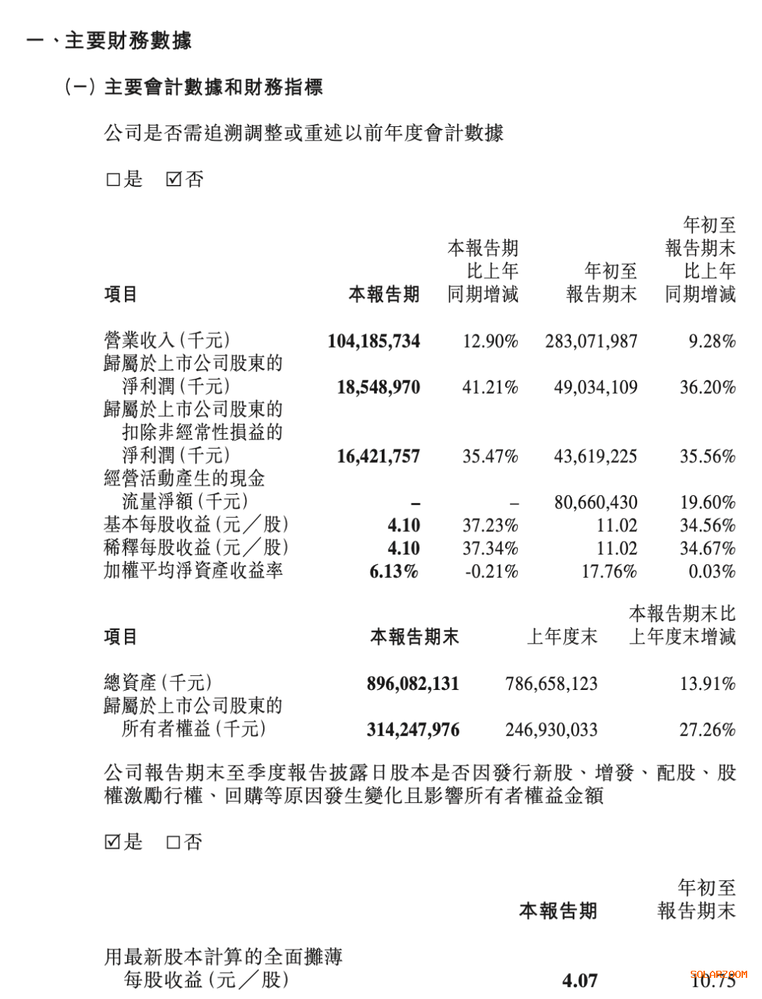10月20日晚间,宁德时代发布2025年三季度财报并举行业绩说明会,数据显示公司前三季度实现营业收入2830.72亿元,同比增长9.28%;归母净利润达490.34亿元,同比增幅36.2%,按此计算每日净赚约1.8亿元。第三季度单季营收与净利润分别达1041.86亿元、185.49亿元,同比增长12.9%与41.21%,业绩高增态势下,公司A、H股股价同步走强,A股收涨2.33%报366.5元/股,H股涨1.25%报528港元/股,彰显资本市场信心。