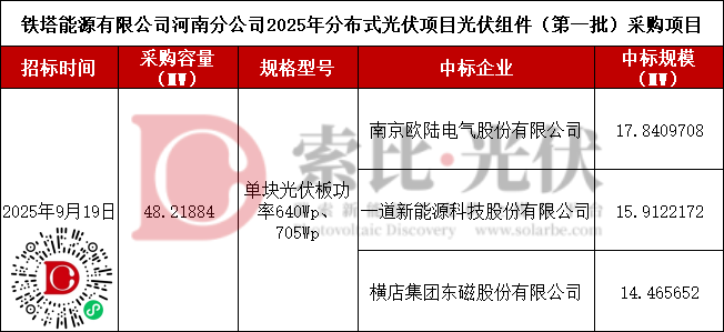 10月22日,铁塔能源有限公司河南分公司2025年分布式光伏项目光伏组件(第一批)采购项目中标结果公示。本次招标预估装机容量48218.84kWp,其中直流叠光项目21614.04kWp,交流光伏项目26604.8kWp,规格型号为单块光伏板功率640Wp、705Wp,交货地点在河南省内招标人指定地点。