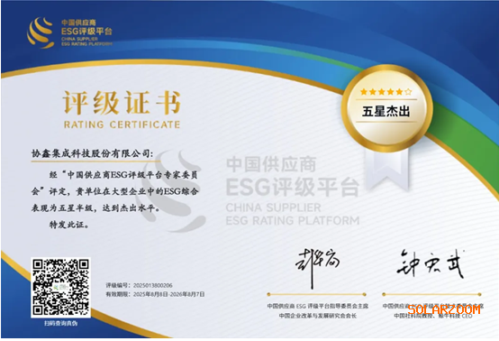 近日,中国供应商ESG评级平台发布2025年最新评级结果,协鑫集成在大型企业中的ESG综合表现达到五星半级,荣获杰出水平评价,进一步夯实其在ESG可持续发展治理领域的行业领导地位。