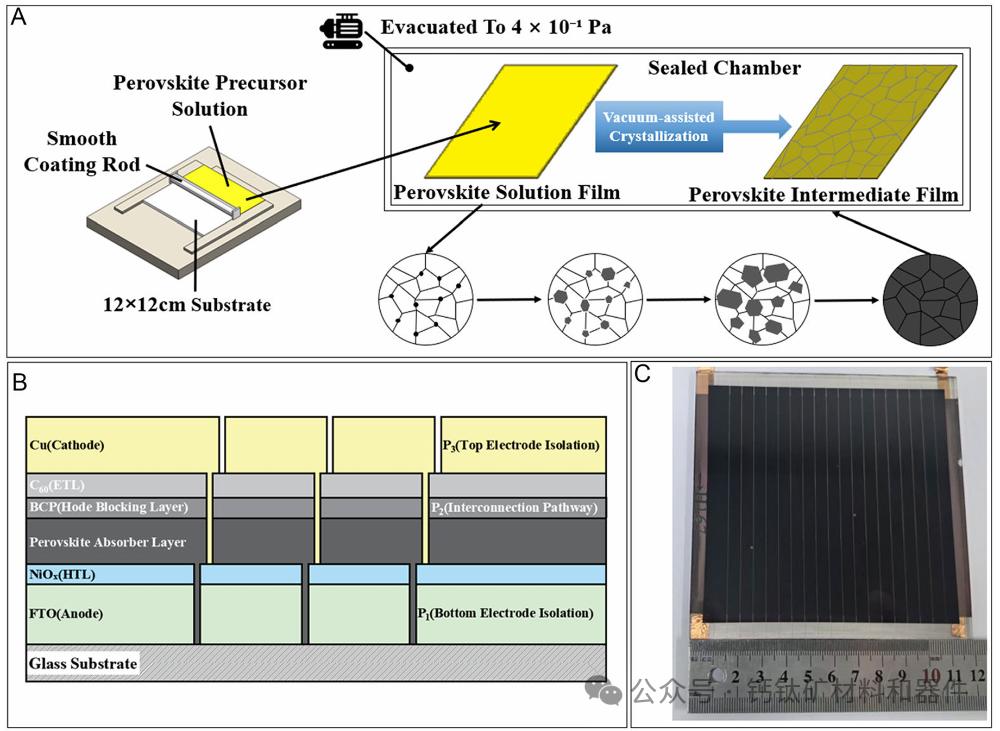 (A) 钙钛矿中间膜制备工艺的示意图。 (B) 器件堆叠结构及激光划片路径示意图。 (C) 钙钛矿光伏组件的照片。(消息来源:Solar RRL: https://doi.org/10.1002/solr.202500560)