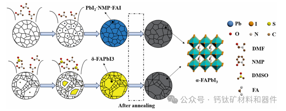 基于 NMP/DMF 和 DMSO/DMF 溶剂体系的钙钛矿薄膜形成示意图。