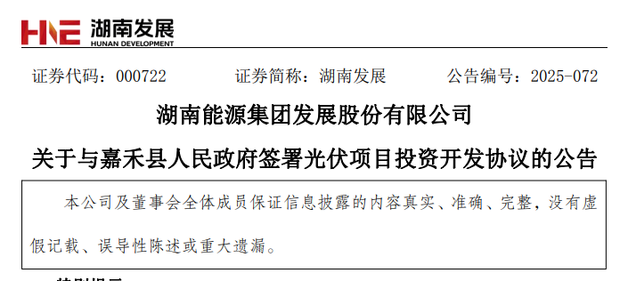 湖南发展公告称,嘉禾县人民政府与湖南能源集团发展股份有限公司本着平等、自愿、互利共赢的原则,经友好协商,签署了《嘉禾县光伏项目投资开发协议》。