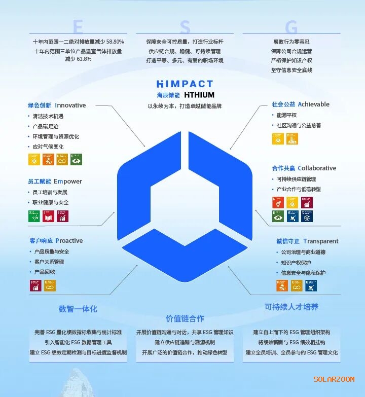 作为ESG理念的积极践行者,海辰储能以 “绿色创新、员工赋能、客户响应、社会公益、合作共赢、诚信守正” 六大核心支柱,构建了 “HIMPACT 2037” 可持续发展战略,全面践行并兑现可持续发展承诺与目标。