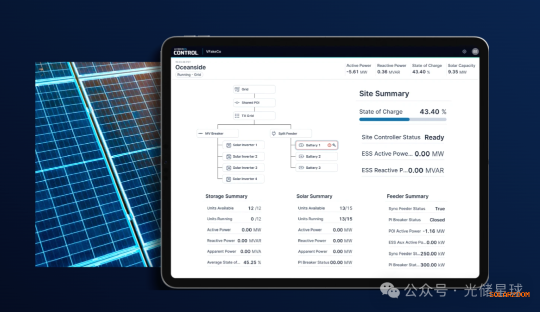 现在,FlexGen的做法是:将光伏电站的主要控制对象纳入HybridOS的统一操作体系中,例如光伏阵列、跟踪系统、气象监测站、电容组等。