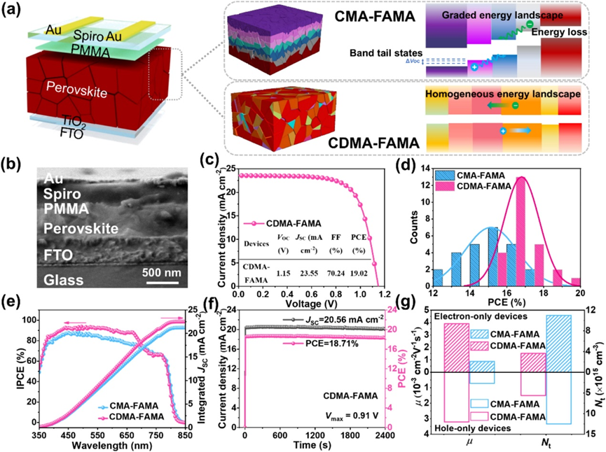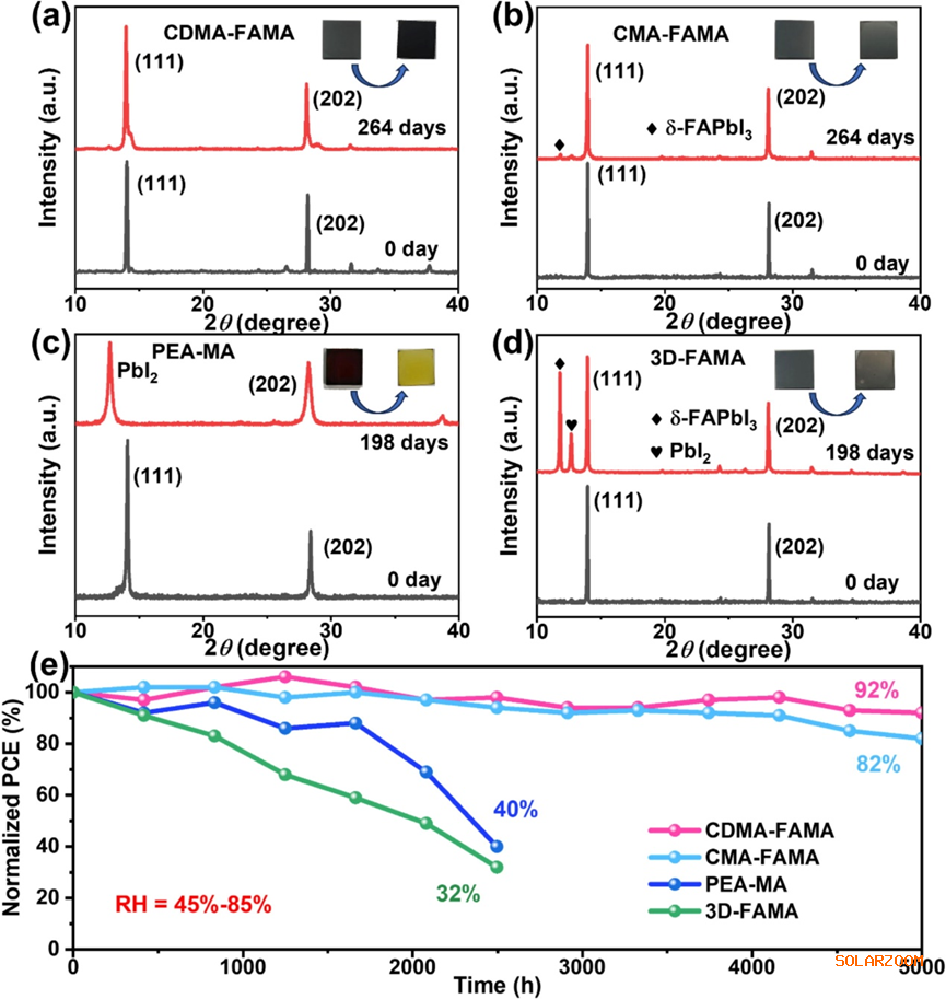 最终,在空气中制备的CDMA基quasi-2D PSCs取得了19.02%的冠军效率,在RH = 45%-85%的空气环境中储存5000小时后仍保留92%的初始效率。