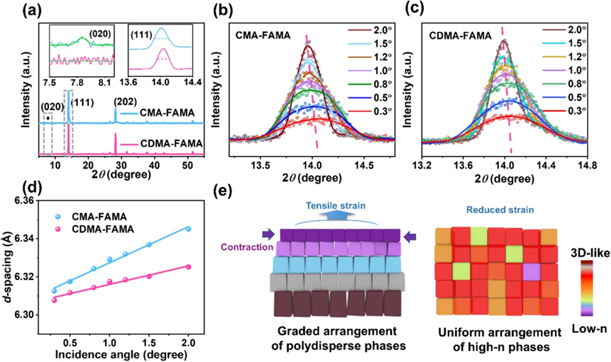 大连理工大学魏一团队提出一种精准调控准二维钙钛矿的量子阱排列方法,有望解决了效率与稳定性的制衡问题。该工作发表于能源领域知名期刊Journal of Energy Chemistry(IF: 14.9),论文链接:https://doi.org/10.1016/j.jechem.2025.07.085.常规溶液法制备的quasi-2D薄膜内的相通常呈现出n值广分布、高n与低n值组分严重分离的特点,导致载流子传输受阻。该工作采用1. 4-cyclohexanedimethanamine(CDMA)作为间隔阳离子,从结晶动力学入手控制其有利量子阱组分形成条件,使量子阱从宽n相分布(n=1. 2. 3 ~∞),转而集中分布在高n相,从而降低晶格应力和缺陷态,促进电荷传输,最终实现了提高稳定的同时,更进一步提高其效率。文中系统阐述了quasi-2D钙钛矿薄膜量子阱的n值分布和空间排列对钙钛矿材料的结构、光电性能,特别是电荷输运性能的影响。实验结果表明,通过条件控制,DJ型钙钛矿中体积庞大的CDMA二铵阳离子桥接在两侧的无机层上,形成大尺寸的胶体,减慢了成核和结晶,使钙钛矿膜富含高n相量子阱,有利于降低晶格应变,减少缺陷态,从而促进载流子传输。