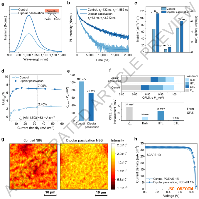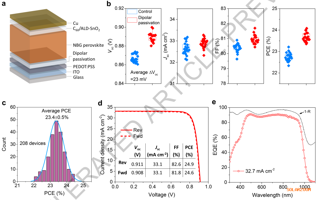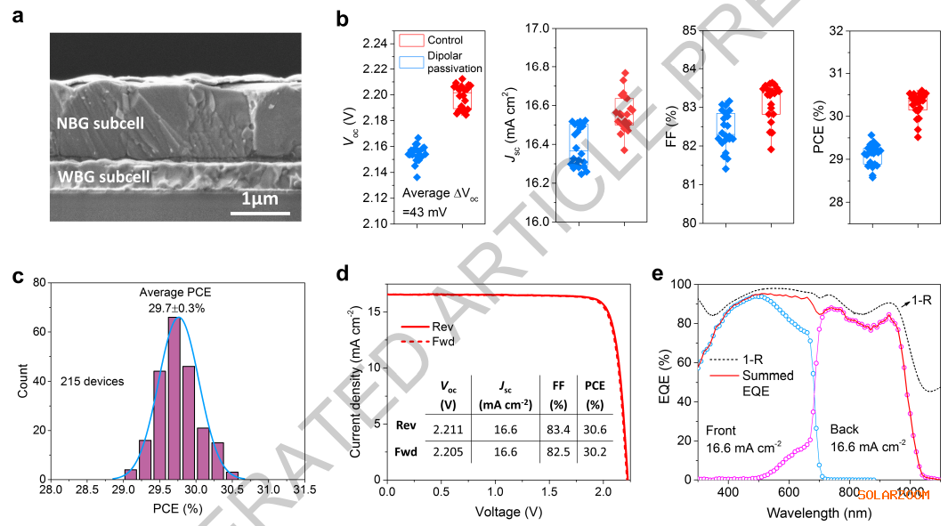 该方法将载流子扩散长度延长至6.2 μm,并显著提高了铅锡钙钛矿太阳能电池的PCE,达到24.9%,同时获得了0.911 V的开路电压(Voc)、33.1 mA cm-2的Jsc以及高达82.6%的FF。此外,该偶极钝化有效减轻了由叠层器件连接层引起的窄带隙子电池中的接触损失,使得全钙钛矿叠层太阳能电池实现了30.6%的卓越PCE(认证稳定效率为30.1%)。