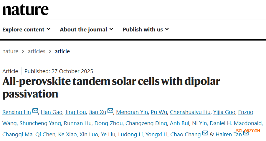 全钙钛矿叠层太阳能电池: 制备了器件结构为 Glass/ITO/NiO/SAM/WBG perovskite/C60/ALD-SnO₂/Au/PEDOT:PSS/NBG perovskite/C60/BCP or ALD/Cu 的全钙钛矿叠层太阳能电池。首先将 NiO 纳米晶(水中 15 mg mL⁻¹)以 3000 rpm 的转速旋涂在 ITO 基底上 30 秒,并在空气中于 130 °C 的热板上退火 30 分钟。NiO 纳米晶根据先前的报告合成。冷却后,立即将基底转移到手套箱中。将未掺杂的 SAM(2PACz 和 MeO-2PACz,浓度相同(IPA 中 1 mM),按体积比 75:25 混合)以 4000 rpm 的转速旋涂在 NiO 薄膜上 20 秒,然后在 100 °C 下退火 3 分钟。通过两步旋涂程序将宽带隙钙钛矿薄膜沉积在 SAM 修饰的 NiO 上。第一步为 2000 rpm 持续 10 秒,加速度为 200 rpm/s。第二步为 6000 rpm 持续 40 秒,加速至 2000 rpm/s。在程序结束前 20 秒的第二阶段旋涂过程中,将苯甲醚(120 µL)滴加到旋转的基底上。然后将基底转移到热板上,在 100 °C 下加热 5 分钟,然后在 85 °C 下加热 15 分钟。对于 WBG 钙钛矿的后处理,制备了 EDAI2(1 mg ml⁻¹,溶于 IPA: 甲苯体积比 1:1 的混合溶剂)和 4F-PEACl(1 mg ml⁻¹,溶于 IPA),并依次沉积。旋涂速度设置为 5.000 rpm,持续 20 秒。当旋涂速度达到最大值时,将 50 μl 处理液滴加到钙钛矿薄膜上。在每次旋涂后处理溶液后,将钙钛矿薄膜在 100 °C 下退火 5 分钟。冷却至室温后,将基底转移到蒸发系统,随后通过热蒸发以 0.2 Å/s 的速率在顶部沉积 20 nm 厚的 C60 薄膜。然后将基底转移到原子层沉积系统,在低温(通常为 100 °C)下使用四(二甲氨基)锡(IV)前驱体在 ALD-SnO₂ 上沉积 20 nm SnO₂。将基底转移回热蒸发系统,在 ALD-SnO₂ 上沉积超薄 Au 团簇层(约 0.4 nm)。将 PEDOT:PSS 层旋涂在前子电池的顶部,并在空气中 120 °C 下退火 20 分钟。基底冷却后,立即将基底转移到充满氮气的手套箱中,使用与单结器件相同的程序沉积对照和偶极钝化的窄带隙钙钛矿薄膜。最后,通过热蒸发依次沉积 20 nm C60、7 nm BCP 和 150 nm Cu 薄膜。关于 ALD-SnO₂ 层沉积的详细信息可在之前的工作中找到。