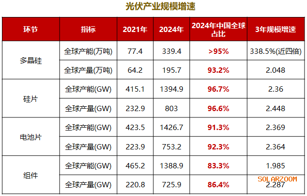 数据显示,截至2024年,国内光伏产业链各环节产能产量全球占比均达80%以上,其中以多晶硅、硅片为代表的上游环节,我国在全球的产业规模占比甚至达到90%以上。