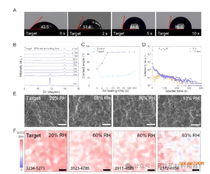 相关实验结果证实,DTAB在结晶完成后迅速迁移至表面,形成疏水层,有效阻隔高湿度环境对薄膜的侵蚀(图3)。关键之处在于开关的“自动关闭”机制。接触角测试清晰显示,在退火开始后约5秒内,薄膜从亲水性(接触角~42°)迅速转变为疏水性(接触角~84°)。飞行时间二次离子质谱(ToF-SIMS)深度剖析证实,DTAB分子在退火过程中自发由体相向表面迁移。这一过程由表面能最小化驱动,从而在钙钛矿薄膜表面形成一层致密的超疏水层,有效“关闭”了水分子通道。正因如此,即使在高达93%的极端湿度下,目标钙钛矿薄膜仍能保持结构完整、晶相纯净,展现出卓越的湿度不敏感性。