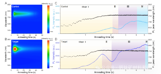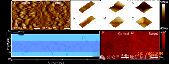 通过分子结构设计与DFT计算,筛选出DTAB作为最优开关分子,其具备长烷基链、强吸电子基团、大尺寸分子等特点,既能促进结晶,又能形成有效疏水屏障。在退火初始阶段,“湿度开关”处于“开启”状态。通过原位光致发光光谱监测(图2),发现DTAB的引入显著改变了钙钛矿的结晶动力学:增加了成核位点,加快了成核速率,并延长了晶体生长时间。原子力显微镜结果表明,添加DTAB的薄膜表面更平整光滑,晶界凹槽和晶面凹陷等缺陷被有效抑制。这表明在开关“开启”阶段,DTAB与水分协同作用,共同引导了高质量钙钛矿薄膜的形成。