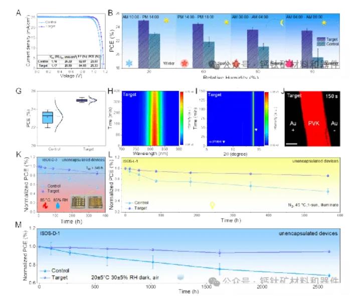 基于该策略制备的n-i-p结构钙钛矿太阳能电池实现了25.33%的光电转化效率(填充因子高达84.93%),且器件性能分布集中,重复性优异。更重要的是,该策略极大地拓宽了制备过程的湿度窗口:在20%至93%的宽湿度范围内,器件效率均保持在较高水平,甚至在93% RH下仍能获得23.55%的效率。在稳定性方面,未封装的器件在环境空气中(ISOS-D-1)存储2602小时后保有初始效率的94.6%;在连续光照(ISOS-L-1)下566小时后保持86.5%;在严苛的双85 damp-heat测试(ISOS-D-3)中,T85寿命超过350小时。激光共聚焦显微镜原位观测进一步证明,该薄膜对电场耦合湿度的侵蚀也具有极强的抵抗能力(图4)。